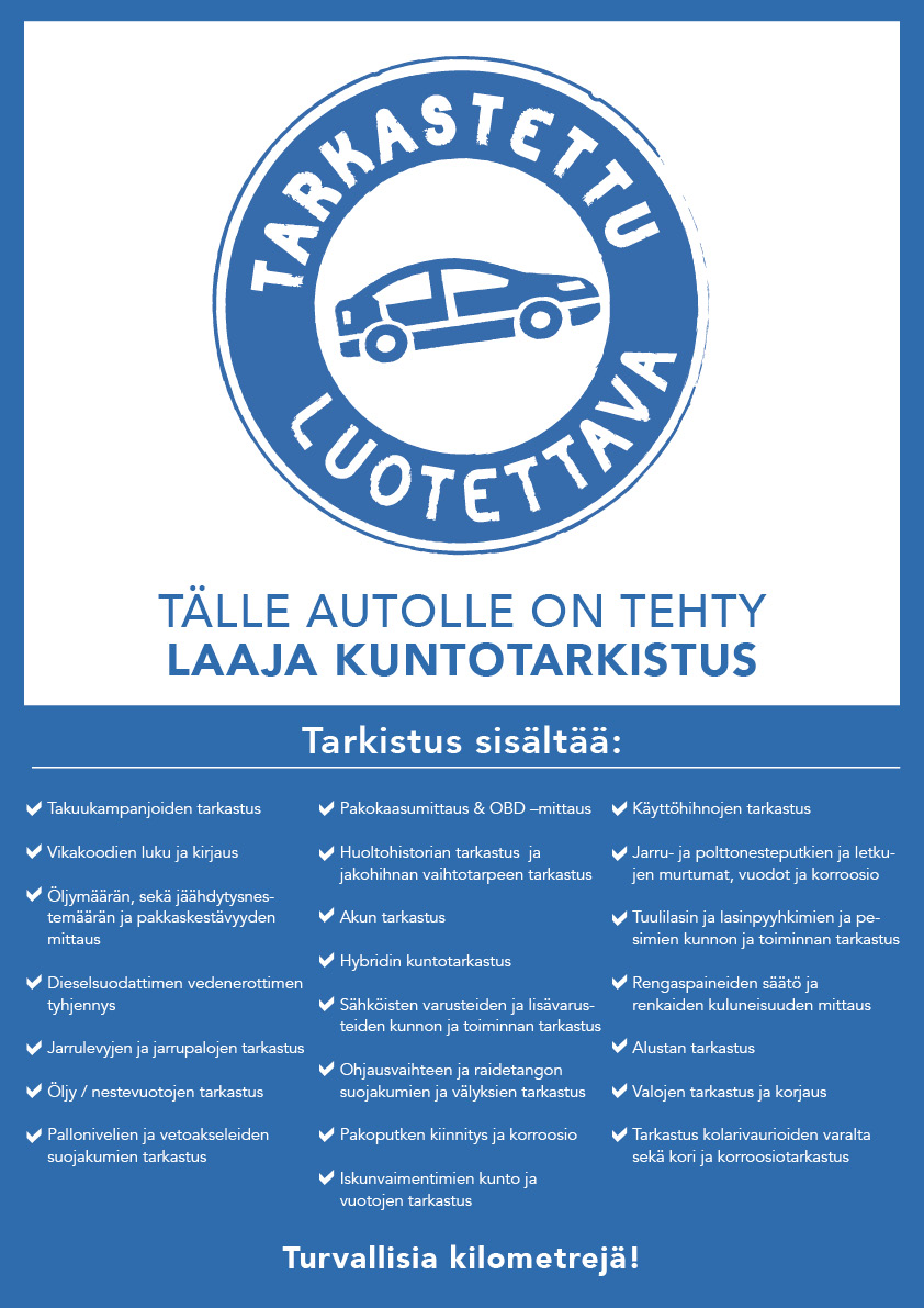 Tarkastuksen piiriin kuluu niin auton tekniikka kuin kuluvat osatkin.