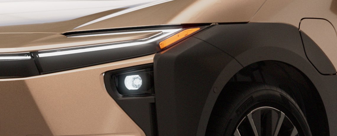 Tunnistettavasti muotoillut ja valovoimaiset ajovalot korostavat Toyota bZ4X Touringin maastokelpoisuutta ja modernia ilmettä.