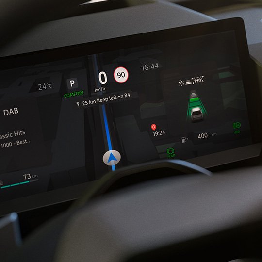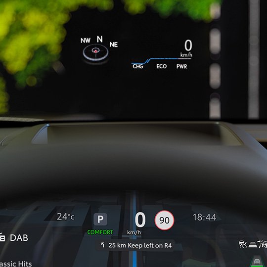 Selkeä 12,3-tuumainen digitaalinen mittaristo esittää keskeiset ajotiedot, akun varaustilan, ajoavustintoiminnot ja navigoinnin.